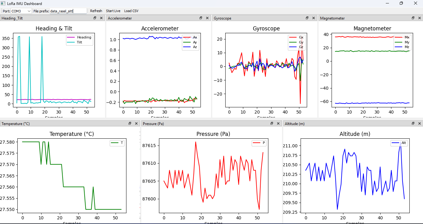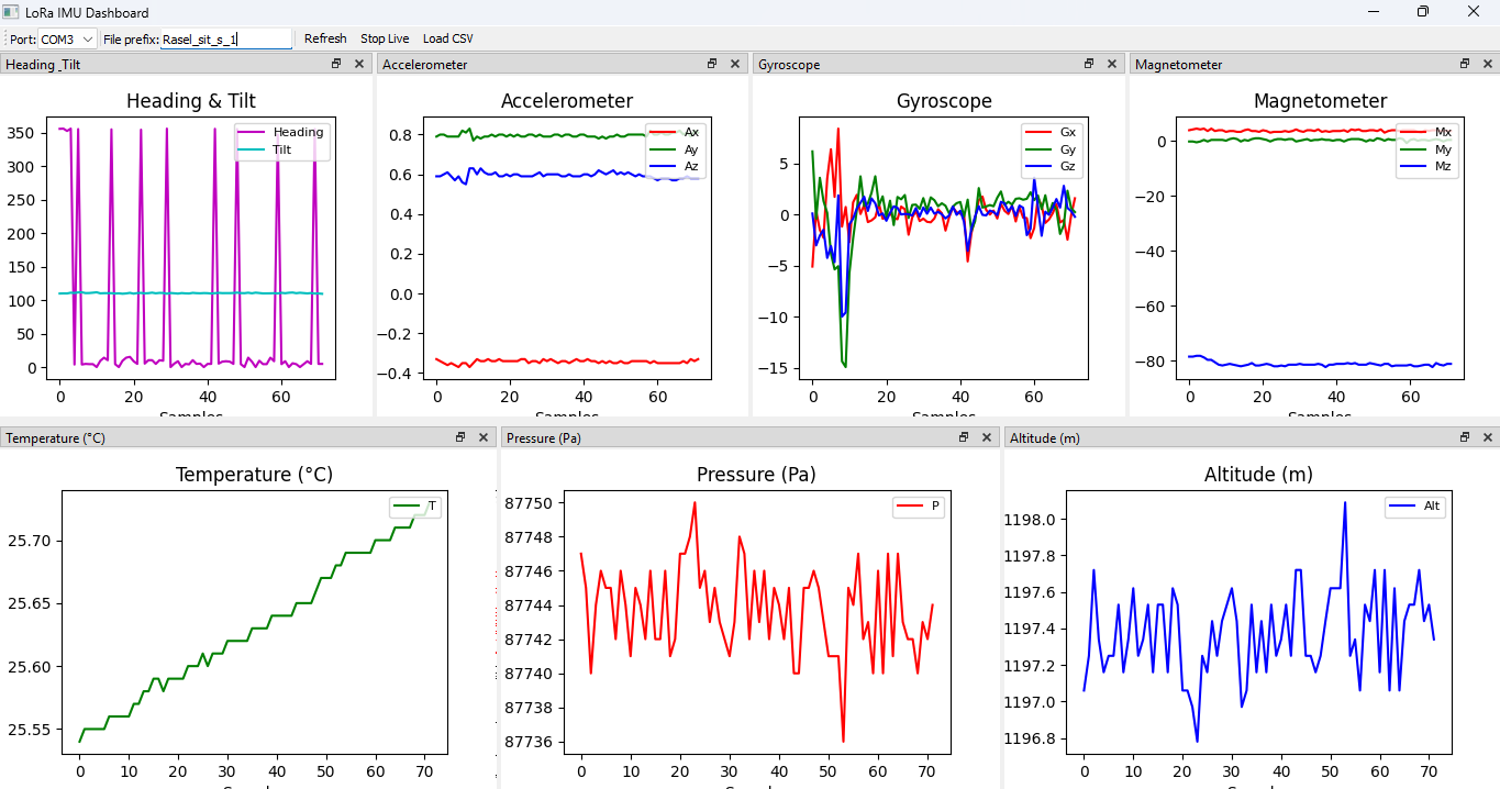 Data Transmission: Sensor readings (accelerometer, gyroscope, magnetometer, temperature, pressure, altitude) were packaged and sent via LoRa at regular intervals (~200 ms).