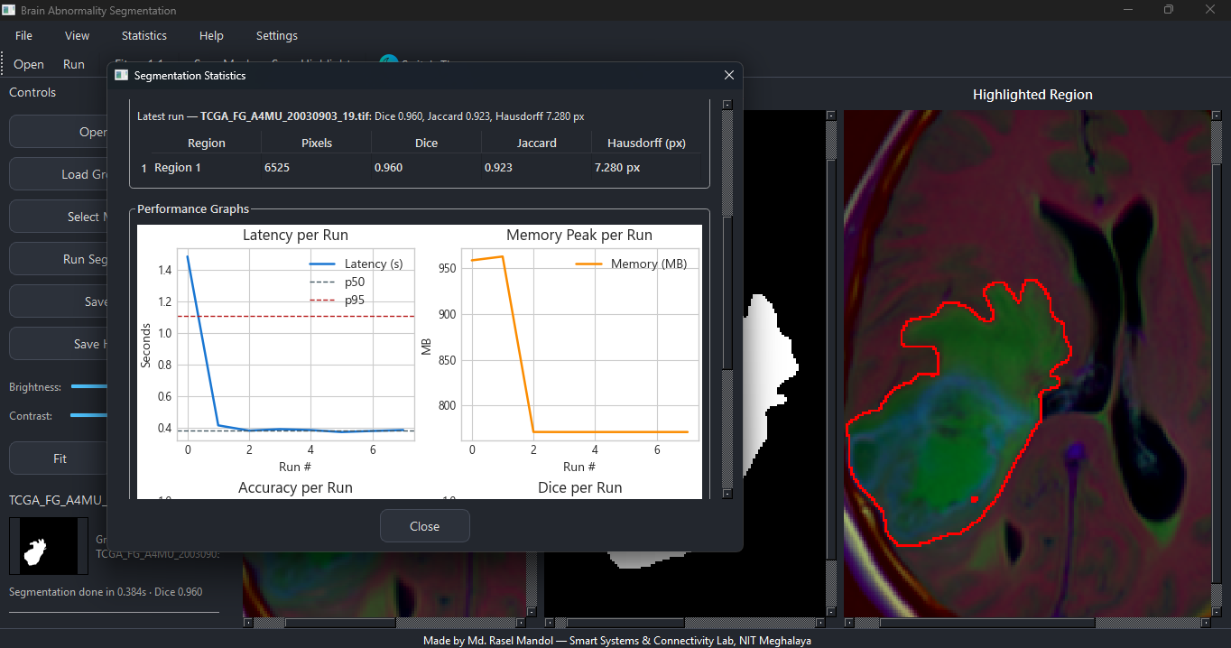- Research-style statistics window (Dice, Jaccard, Hausdorff, latency, memory, trend plots).